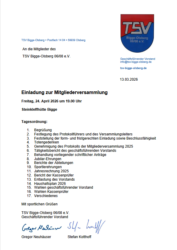 Die diesjährige Mitgliederversammlung findet am Freitag, 24.04.2026 um 19 Uhr in der Steinkleffhütte Bigge statt.